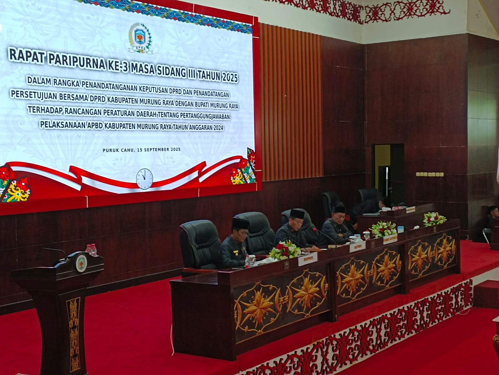 PURUK CAHU – Pemerintah Kabupaten Murung Raya (Pemkab Mura) bersama DPRD menyetujui Rancangan Peraturan Daerah (Raperda) tentang Pertanggungjawaban Pelaksanaan APBD Tahun Anggaran 2024 melalui Rapat Paripurna ke-3 Masa Sidang III Tahun 2025, Senin (15/9/2025).