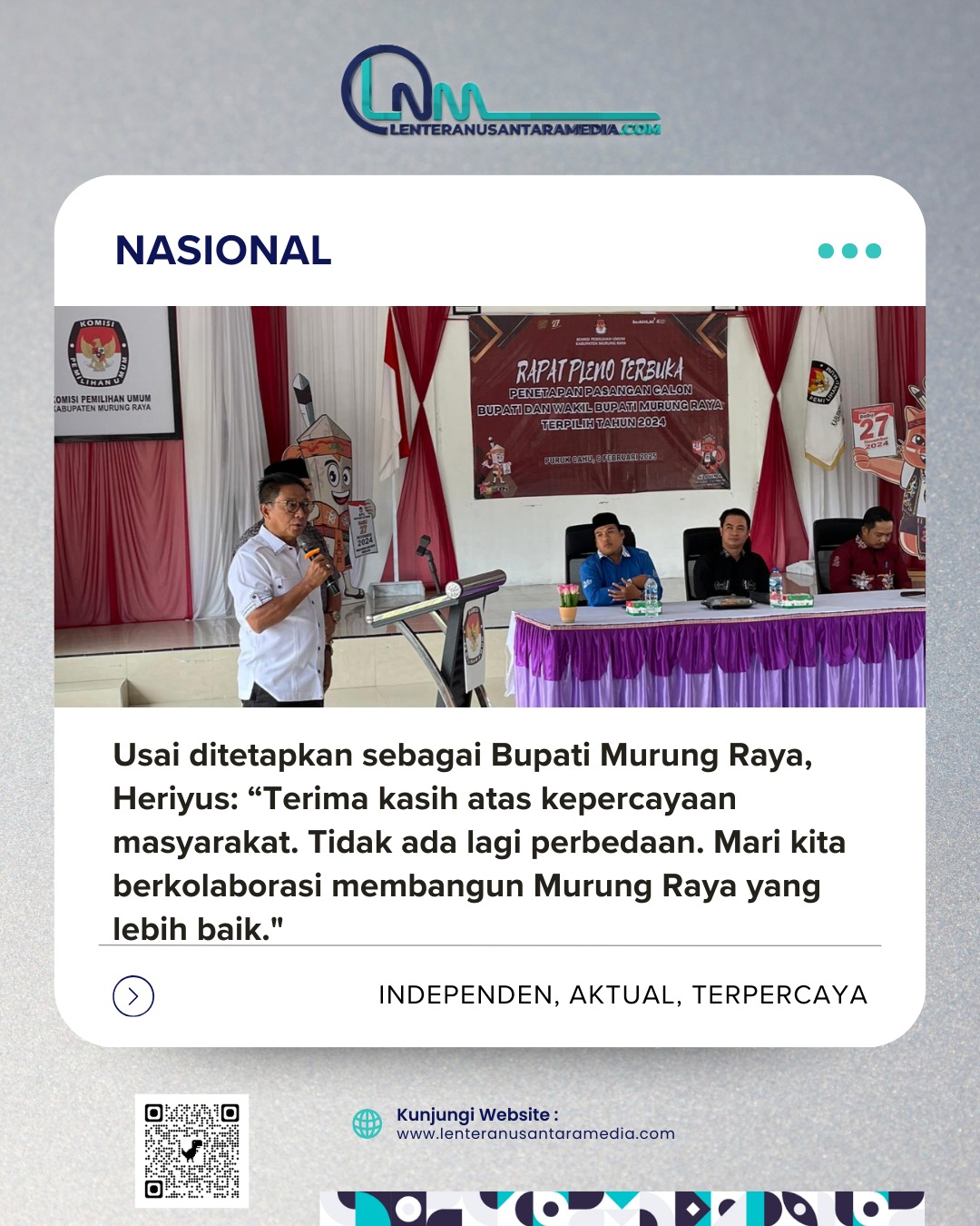“Dalam Kesempatan ini saya atas nama pasangan terpilih yaitu Heriyus dan Rahmanto mengucapkan terimakasih kepada panitia pelaksana pilkada baik itu KPU, Banwaslu, Pemerintah, keamanan baik TNI, Polri yang menyita waktu, pemikiran dan tenaga sehingga bisa berjalan dengan baik dan juga seluruh  masyarakat kabupaten Murung Raya yang  saya cintai dan saya banggakan, karena telah memberikan hak pilihnya untuk dipercaykan kepada saya dan Rahmanto, jadi tidak lagi ada pendukung si A dan si B, mari berkolaborasi bersama membangun kabupaten Murung Raya ini”Kata Heriyus Kamis 06/02/2025.