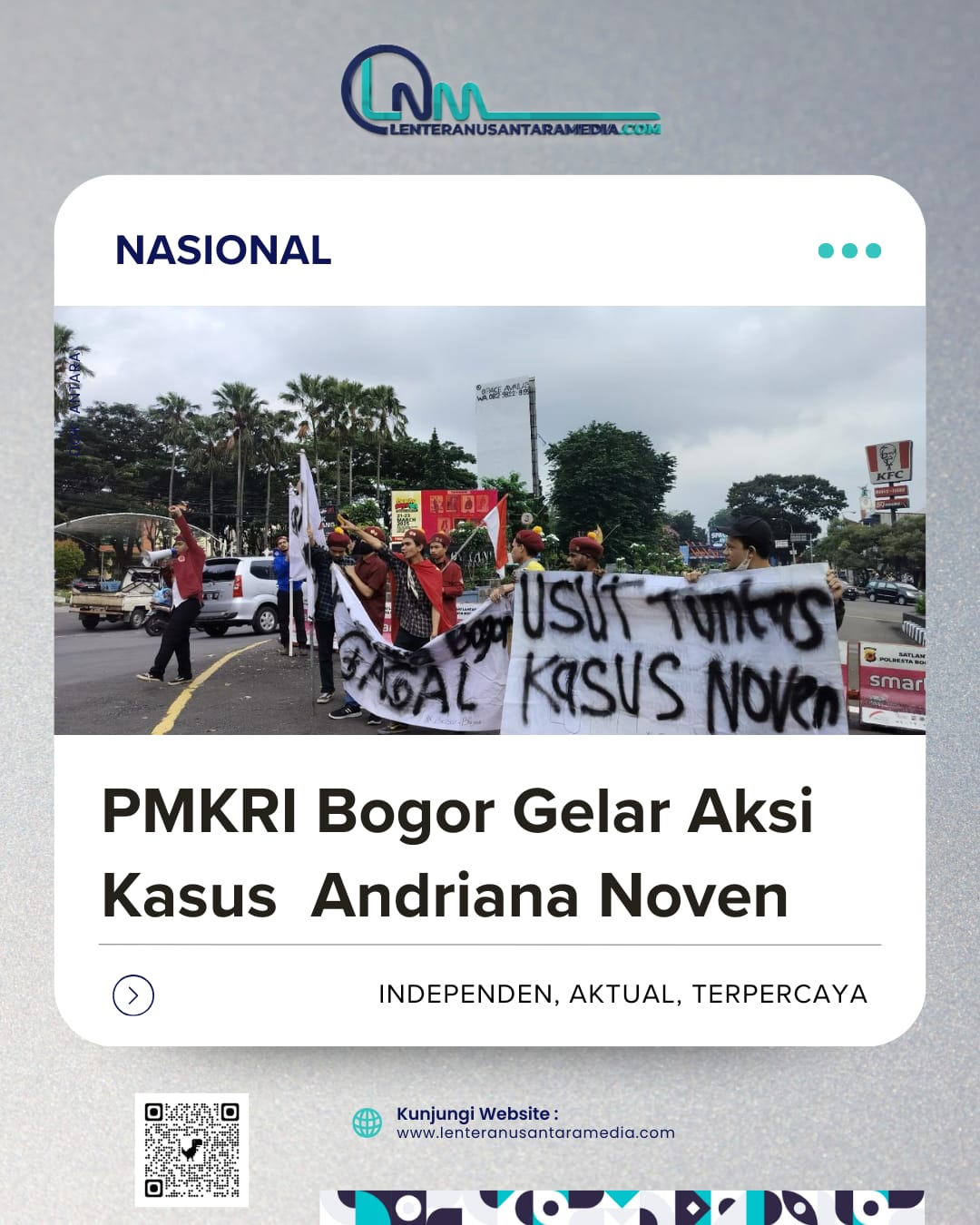 Bogor-Perhimpunan Mahasiswa Katolik Republik Indonesia (PMKRI) Cabang Bogor hari ini menggelar aksi demonstrasi di depan Mapolresta Bogor Kota untuk mengenang enam tahun kasus pembunuhan Andriana Noven yang hingga kini masih belum menemui titik terang. Aksi ini dilakukan sebagai bentuk protes atas lambannya penanganan kasus tersebut dan sebagai desakan kepada pihak kepolisian untuk segera menuntaskan penyelidikan. pada Senin 17 /03/ 2025 .